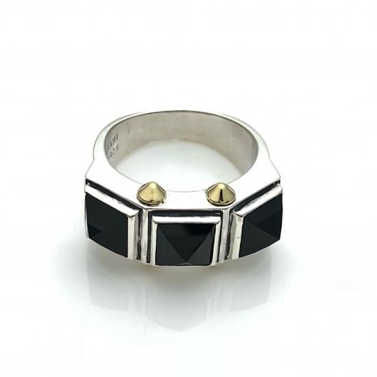 ROCKをテーマに、スタッズに見立てた天然石オニキスを3個、サイドにもゴールドのスタッズを4つ配置した、パンキッシュながらも大人のジュエリー感があるリングです。