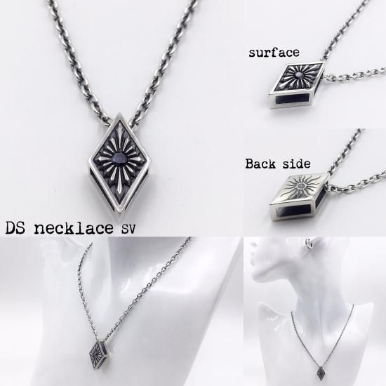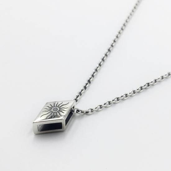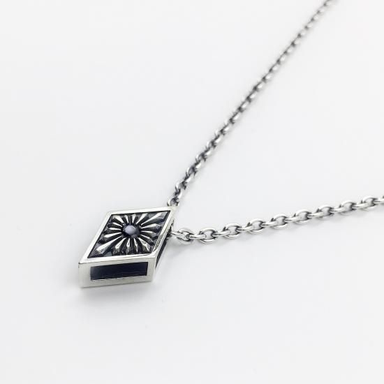 菱形のプレートを2枚立体的に組み合わせ、中にチェーンを通してペンダントにしました。